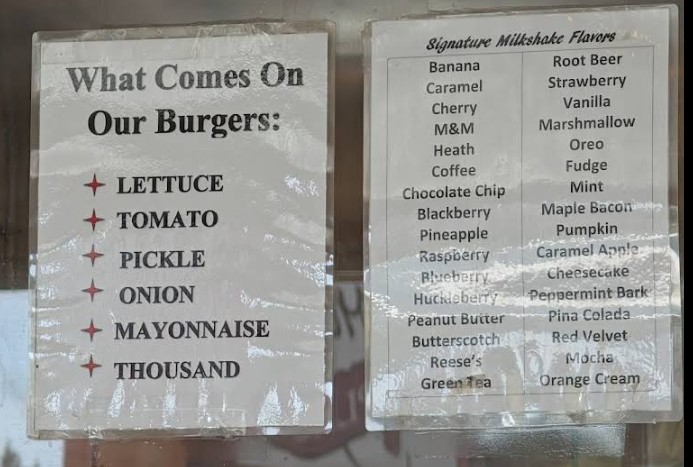 Burgers were big and tasty 😋! They have a perfect burger sauce and they toast the buns perfect so the burger stays together and don't fall apart while eating it. Big variety of milk shakes that were also made excellent 👌. Family owned and operated and you can tell they take pride in their business. Will definitely eat there again when I am down there.